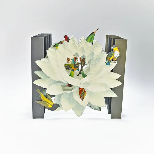 I rarely build tunnel books this elaborate because I find them complicated, but once I begin the process I find my rhythm of cutting (drawing with my X-acto knife), creating the gussets and, of course, adding in all the imagery. I have had these colorful images of fish for a while—now they have a new home in their under-the sea-paper-aquariums.