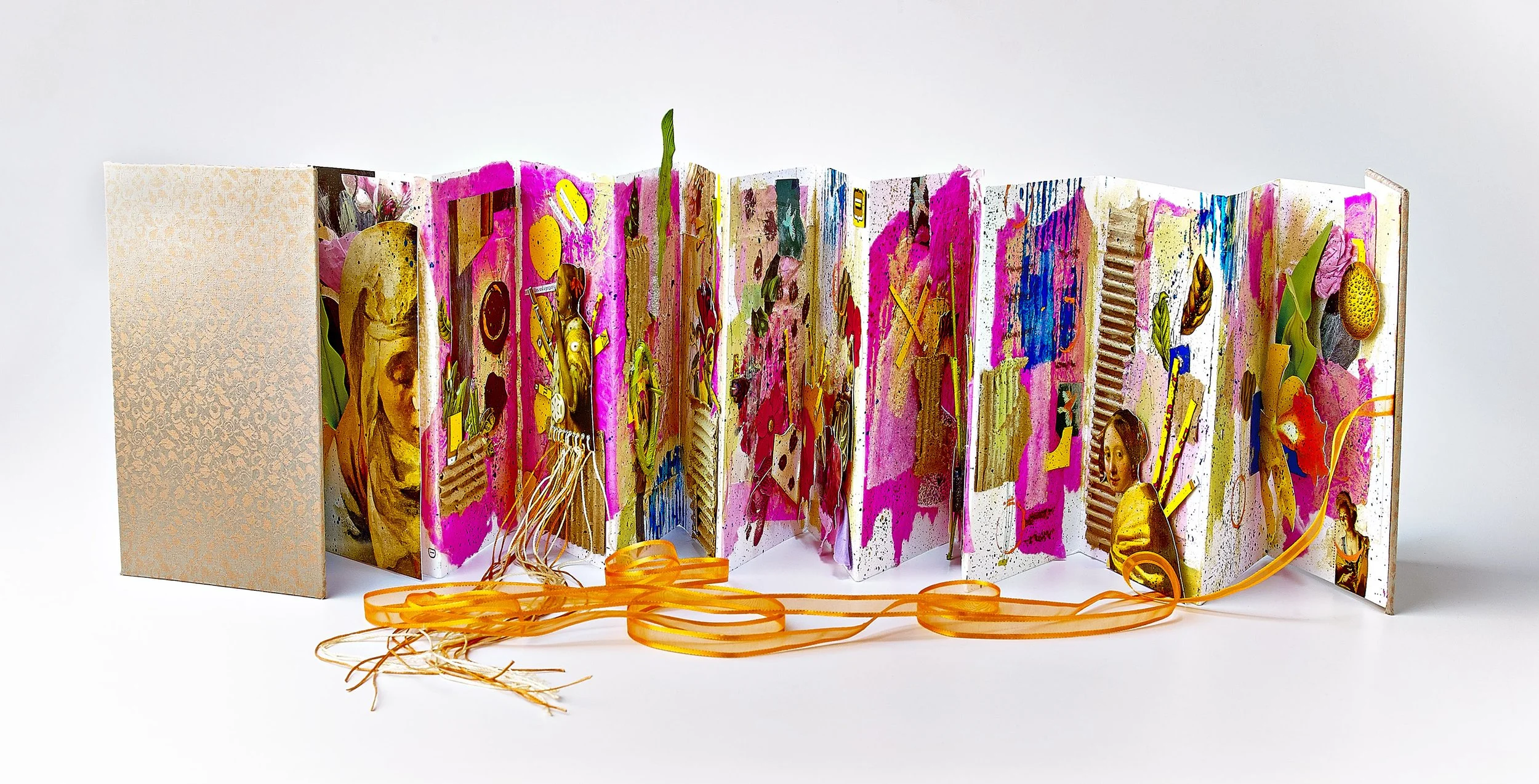 Abstract/Vermeer, 2025, was featured in Kalamazoo’s Illustrated Accordion Exhibition at the Kalamazoo Book Arts Center, from February--March 2026. My expansive accordion book measures approx. 63 inches long by 8 inches high and is decorated with book cloth, papers, tissue paper, acrylic cardboard, collage, pencil, random packaging + type, thread, ribbon. The book was purchased after the exhibition and is now in a private collection.